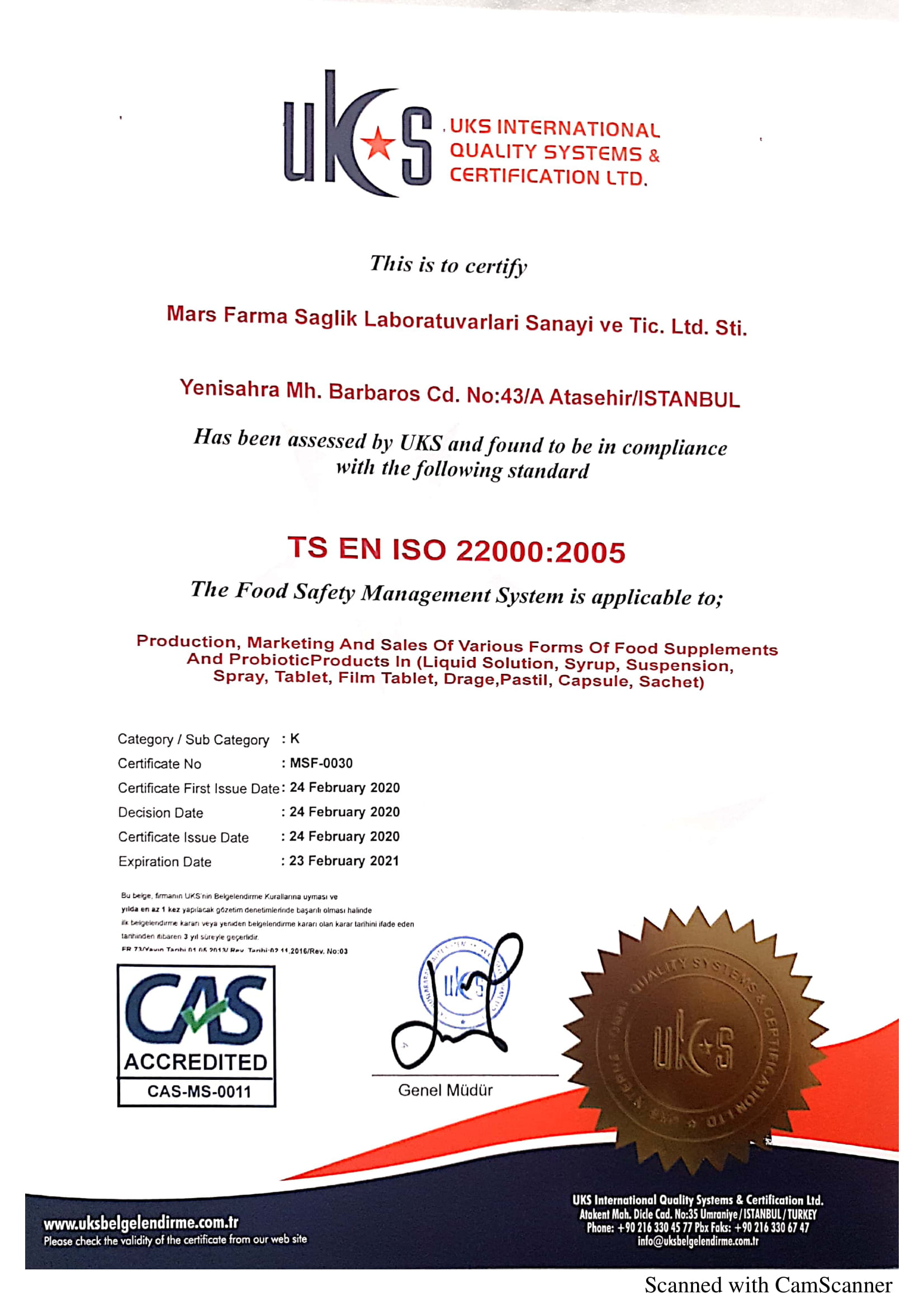 in order to keep product quality at the highest level. In addition to the on-site inspections carried out by the “Türkiye Ministry of Food ” every year, we also have certified our corporate structure by accredited organizations such as American CAS .